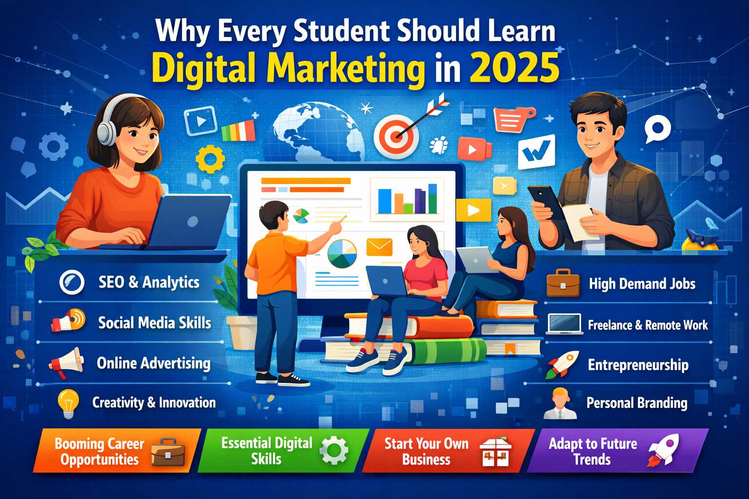 Digital marketing is an essential skill for students in 2025 because businesses increasingly rely on online platforms to reach customers. Learning digital marketing helps students gain valuable skills in SEO, social media marketing, content creation, and online advertising. It also opens up career opportunities, freelancing options, and entrepreneurial possibilities. With the growing importance of the internet in business and communication, digital marketing knowledge gives students a strong advantage in the modern job market.